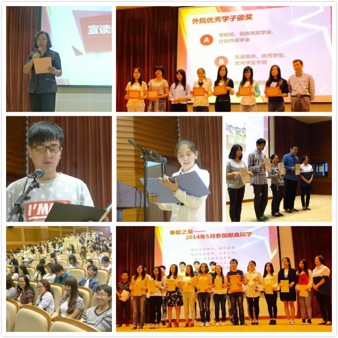 表彰活动中,颁发了2014年度外语学院优秀学生、优秀学生干部、国家奖学金、计划外奖学金等常规奖项,同时表彰了一批在心理健康教育、志愿服务、体育运动、艺术普及以及社会实践方面表现突出的同学。住友奖学金获得者王琪、发展全面的少数民族同学茹鲜姑丽,以及积极参加献血的学生代表周晨玺同学分别分享了自己在学风建设、专业学习、社会实践、志愿服务等方面的成长心得。表彰活动上,余毓国希望同学们能够把握好当下的每一天,为明天做好充分的准备,用脚踏实地的奋斗成就梦想的实现。