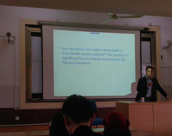 讲座中,武光军教授讲解了关于叙事学的基本概念及叙事学在翻译、新闻报道等研究中的应用。他通过对翻译研究中两种传统方法,包括社会叙事学以及经典叙事学的阐述,介绍了自己在研究过程中所采用的叙事学方法。武光军教授还以《河岸》的英译本为研究案例,具体形象地描述了译文案例,并深入浅出地向同学阐述了叙事学在翻译中的重要作用。在提问环节中,武光军教授与现场师生积极互动,并就大家的提问进行了解答。