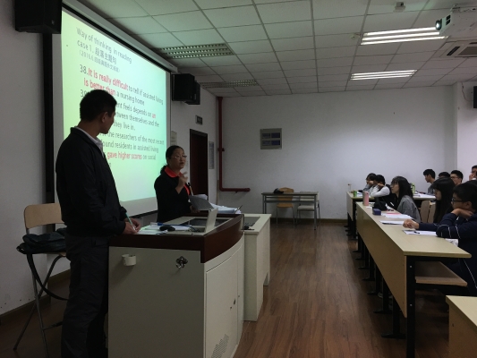 10月29日下午,奉贤校区E教的105教室里传来整齐而响亮的读书声:“君子曰:学不可以已。青,取之于蓝,而青于蓝;冰,水为之,而寒于水。”一场由bat365在线平台官网大学英语教学部教师吴承钧主讲的题为“中西思维差异对英语读写的影响”的讲座正在如火如荼地进行。本次活动是大学英语党支部教师深入开展“两学一做”学习教育,以知促行开展的“周末公益讲座”暨2016级“励志明德班”共建活动英语学习系列讲座的第四讲。