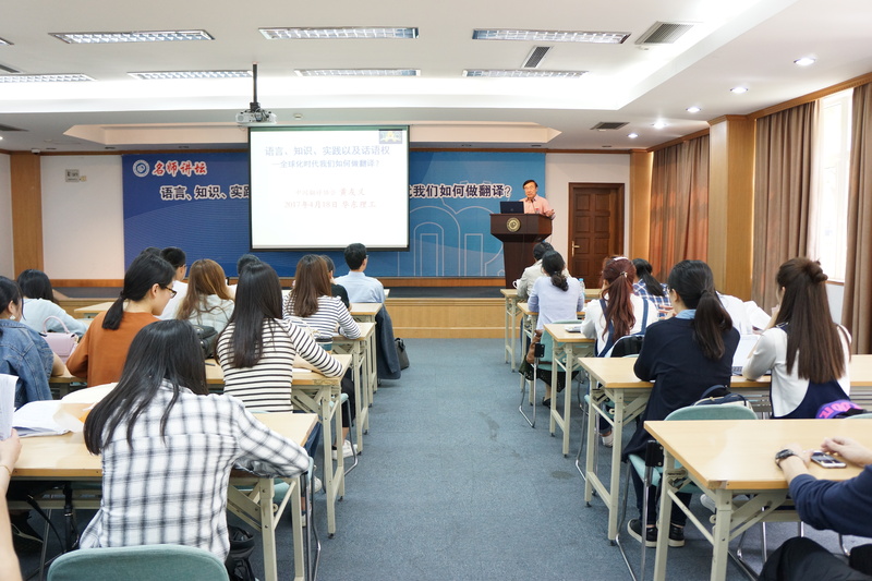 4月18日下午,应bat365在线平台官网邀请,全国政协外事委员会委员、中国翻译协会常务副会长黄友义教授在徐汇校区逸夫楼演讲厅作了题为“语言、知识、实践以及话语权——全球化时代我们如何做翻译”的精彩报告。bat365在线平台官网副院长吴建伟、赵宏及来自各学院的近百名师生参加报告会。报告会由bat365在线平台官网王建国教授主持。