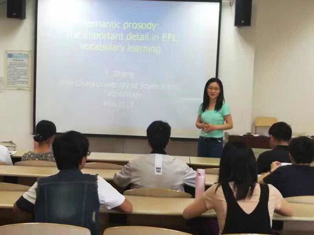 5月11日中午,学院大学英语教学部张艳博士在奉贤校区E教119室为本科生作了一场题为“大学英语词汇学习中的语义韵——你可能忽略的重要细节”的学术讲座。本讲座是人文社会科学处65周年校庆之青年学术论坛(奉贤校区专场)活动之一,bat365在线平台官网本学期校庆期间的学术系列讲座活动正式拉开帷幕。